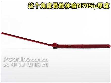 NEC N705iμ 在2007年底,NEC推出了一款3G折叠手机,其9.8mm的机身厚度打破了3G折叠手机的厚度纪录,这就是NEC N705iμ。极致超薄的造型是N705iμ最大的亮点,高质感机身设计、一流的造工在3G手机领域无出其右。这次PConline评测室就迎来NEC N705iμ,以不同角度带大家领略世界第一薄的魅力。 极致惊艳之薄 问鼎3G世界第一 NEC N705iμ 在3G折叠手机领域里,N705iμ的9.8mm厚度还是维持着第一薄的称号。对手机市场较为熟悉的玩家可能也记得三星U308这款超薄手机,其9.6mm也是世界第一薄的,可惜U308并不是3G手机。 三星U308机身厚度9.6mm 三星U308机身厚度为9.6mm,比N705iμ还薄0.2mm,为世界第一薄的折叠手机。不过U308并不具备3G功能,性能上与N705iμ有比较大的差距。 三星U108机身厚度为5.9mm 世界最薄的手机为三星U108,其机身厚度为5.9mm。不过U108也不具备3G功能,当然性能上比起N705iμ有更大的差距。 NEC N705iμ NEC运用不锈钢以及高碳棒工程塑料混合打造N705iμ,不同材质分别用于不同部位,以达到最高的强度以及最高的材质运用效率。N705iμ机身整体质感强烈,充满日系手机大厂风范。除了屏幕之外,机身其他部位都没有采用抛光处理,抗污性较好。 NEC N705iμ NEC N705iμ NEC N705iμ 极薄外形不含糊 性能很好很强大