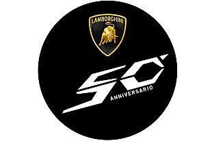 50周年活动徽标由阿拉伯数字“50”和意大利文“anniversario”两部分组成。数字“50”置于意大利文“anniversario”的上方,线条简洁明快、清晰硬朗,宛如兰博基尼超级跑车迷人、刚毅的车身。