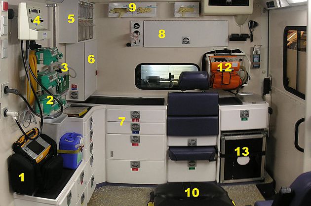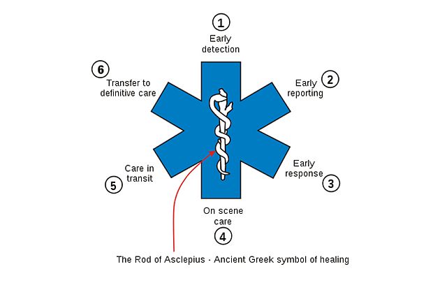 救护车的标志为“The Star of Life”(生命之星),造型为蓝色六角星,白底,中间有阿斯克勒庇俄斯(希腊传说中的医术始祖,拥有治愈之力)的拐杖,正如你所看到的,是一根蛇缠绕的树枝。尽管还有一些别的说法,但最终公认的是上述表达。这个标志的设计者为美国高速交通安全事务所(NHTSA)。在美国,这个标志通常用来标志救护车、救护人员或者其他一些紧急救治服务中心的人员,在国际上,它通常是用来标志紧急救治服务中心的车辆和人员。顺便提一句,我们经常看到救护车上的“Ambulance”的字样是镜像的,那是为了让它在前车的后视镜里看到的是正的字母排列,方便确认。