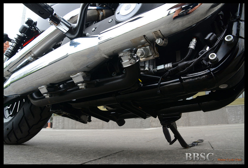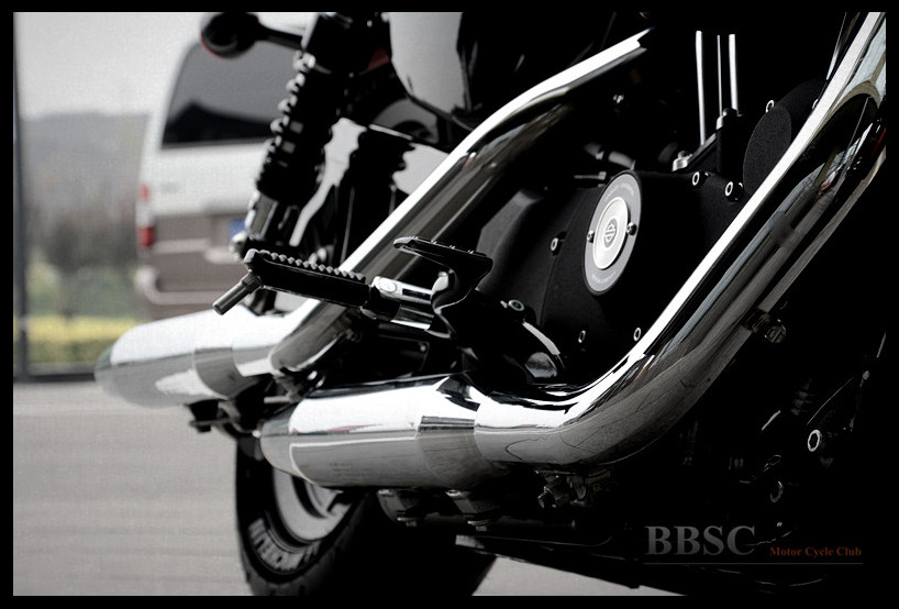 每个汽缸独享一根镀铬排气管,有效避免了两个汽缸的排气干涉。两根排气管为等长式设计,并因发动机的摆放位置而前后交错。