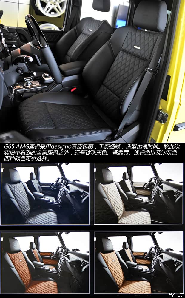 [汽车之家 新车图解] 如果您是第一眼见到奔驰G级这样一个棱角分明的大方块,一定会觉得它跑不快,只是一个用来越野的大怪物而已。不过从G500到G55 AMG,奔驰已经给我们证明了不遵循空气动力学设计其实也可以跑的很快,只要心脏足够强大就好。于是按照这个逻辑,他们在推出了G55 AMG和G63 AMG之后 ,又带来了这款搭载6.0升V12发动机,拥有最高612马力和1000牛·米的硬派越野车——G65 AMG,而且今天我们见到的这台还是采用足够抢眼的”亮黄色”涂装,我相信在此之前,你应该没有见过它。