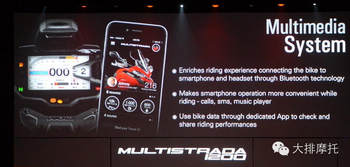 3C产品盛行,DUCATI将Multistrada 1200建立DMS的多媒体系统,透过骑士使用的手机可自行下载软件,透过蓝牙传输进行多媒体的播放以及操控。