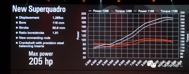 这样的跃升,也让DUCATI的市售跑车动力一举跨出了200hp的界线,最大马力205hp的输出,比较起1199 Panigale S的引擎,足足大了10hp之多,而车辆净重却只有小幅上涨2.5kg,可想而知,在引擎的开发上DUCATI确实投入的不少心血,试图让车身拥有更完美的马力重量比。