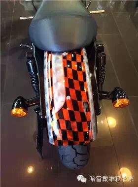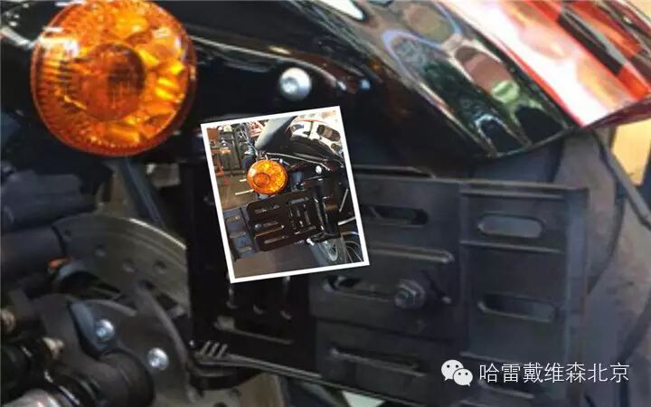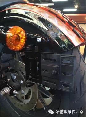 说到此,你恐怕疑惑车牌架在哪里呢?这也是限量套件的一个改装特点,条形灯的两侧是常规的两个小尾灯,而就在左侧尾灯的下方有一个可以展开回折的牌架,牌架上面有几个小孔专为固定车牌设定。无论骑手是想让车牌朝后还是朝左,只需轻轻折一下。哈雷如此精小的细节设计,在给骑手自由随意的体验同时,也说明了哈雷的匠心独运。