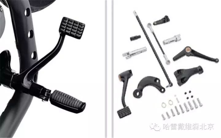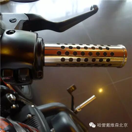 硬汉的车把改装后别具特色。车把由原来弯曲的内弯式改为直把,两个车把从车轴分别向外平直伸出,车把简洁微小的弯度让骑手更容易操作扭转。不仅如此,把手改用了消音器式不锈钢把手,一方面显示出刚硬与猛烈,另一方面,把手上有规律的小孔排列一起,极具美感。手握这样的把手,让人感觉似乎可以控制一切。与把手相同的是,脚踏也改为消音器式脚踏。而且脚踏由原来的中置脚踏前移改为前置脚踏,以便让骑手的腿部自由伸张,使身体在驾车过程中更加舒展。