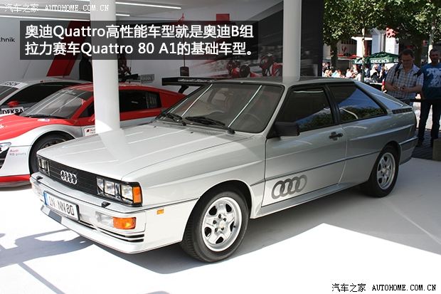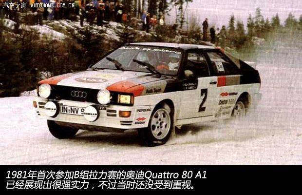 不过上世纪80年代之前,四轮驱动技术大多用于越野车和军用车辆,很少被用于常见的轿车上。四轮驱动技术真正得以大放异彩,还要从奥迪汽车参加世界拉力锦标赛B组开始说起。1981年动力输出300马力的奥迪Quattro 80 A1成为首款参战的B组拉力赛车,不过四轮驱动技术的优势在这时还没有被重视。