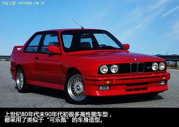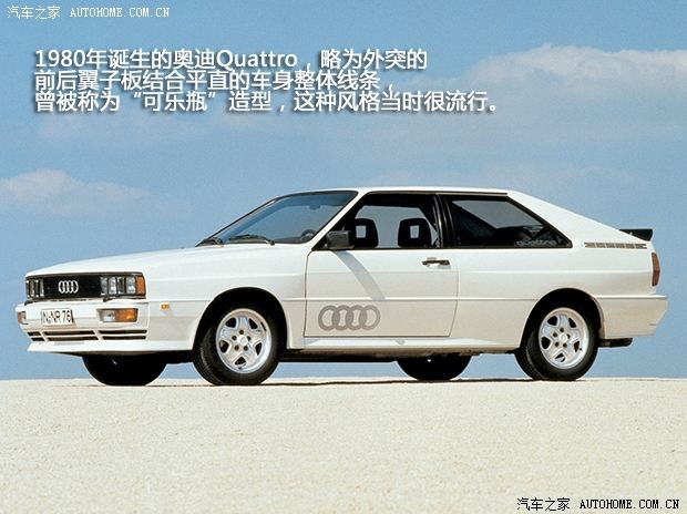 1980年诞生的奥迪Quatrro,采用了和奥迪80相同的B2车身平台,双门Coupe车体构成了工整的梯形车窗框架,略为外突的前后翼子板为平直的车身线条增加了些许动感。这种曾被称为“可乐瓶”的车身造型,也出现在之后的宝马第一代M3和日产第三代Skyline GT-R车型之上。