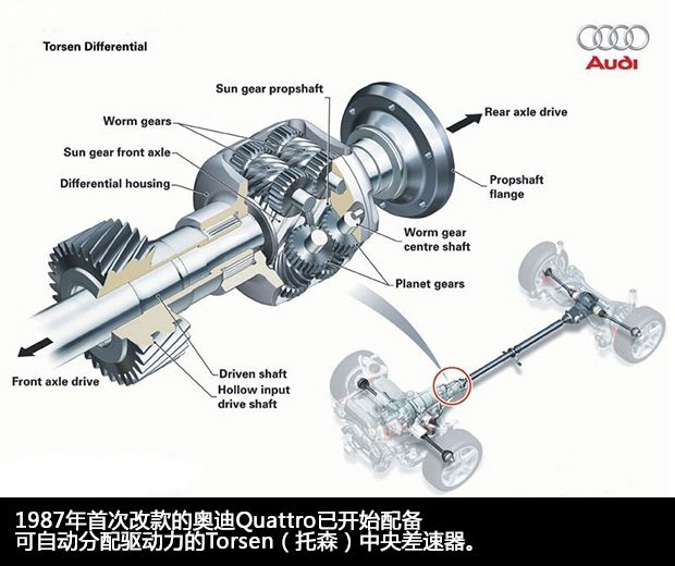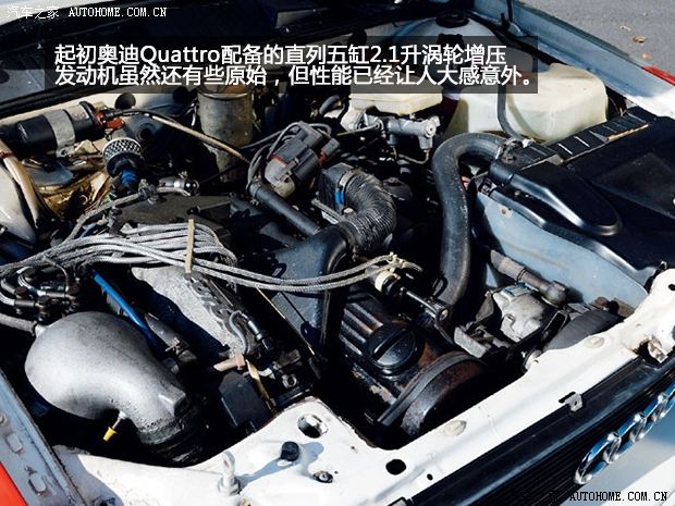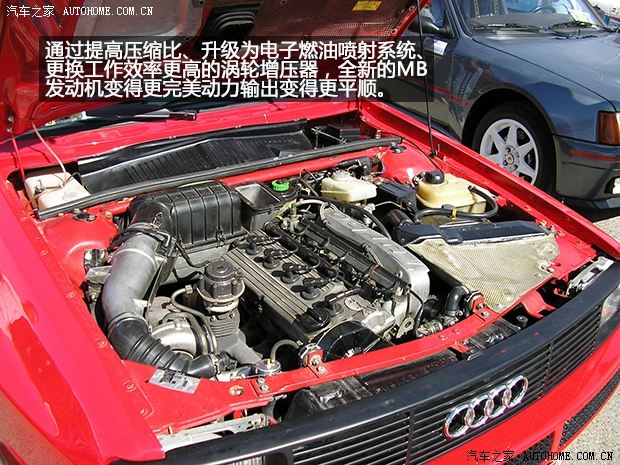 在这11年中这一不朽的车系还经过不少改进,1987年配备全新的MB型2.2升直列五缸涡轮增压发动机的中期改款型奥迪Quattro问世,通过提高排气量、压缩比和改进燃油喷射系统的方式,最大扭矩的输出转速降低至每分钟3000转,影响动力输出平顺性的“涡轮迟滞”也得到了有效的改善。之前需要由手动锁定的中央差速器,也由自动分配驱动力的Torsen(托森)中央差速器取代。