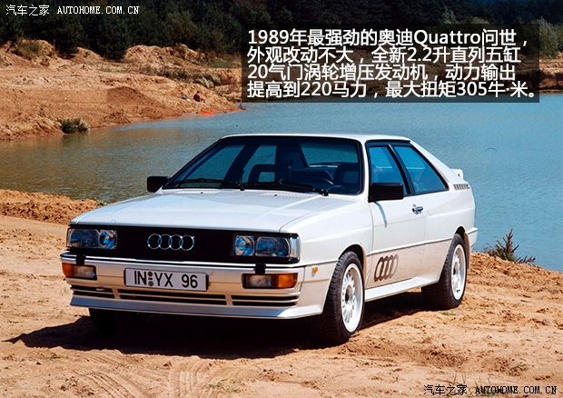1989年奥迪Quattro的最终改款问世,改款的重点仍集中在动力系统上,虽然排气量没有变化,但是全新设计的顶置双凸轮轴20气门缸盖明显提高了进、排气效率,压缩比提高至9.3:1,全新的博世电子燃油喷射系统也首次得以应用。结果就是最大动力输出在每分钟5900转时达到164千瓦(220马力),最大扭矩仅在每分钟1950转时即可达到305牛·米,在车重基本没有增加的情况下,0-100公里/小时加速用时仅6.3秒,最高时速提高至230公里/小时。
