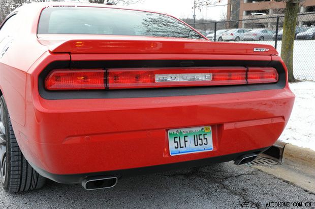 高亮镀铬的油箱盖,似乎是美国人在炫技自己的高超“镀铬工艺”。  来到尾部,“小鸭尾”的设计,对于一款排量达到6.4L的“速度利器”而言,略显低调。轮廓厚重的保险杠,配合贯通设计的窄条车后灯组,让人脑海中浮现出了一张“国字脸,眯缝眼”的人面形象。而右上角的“SRT”标识,就像那张“国字脸在久经沙场之后,留下的战斗烙印”。排气尾嘴,采用镀铬扁口的双边双出设计。