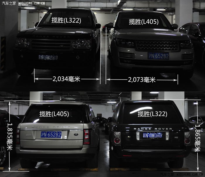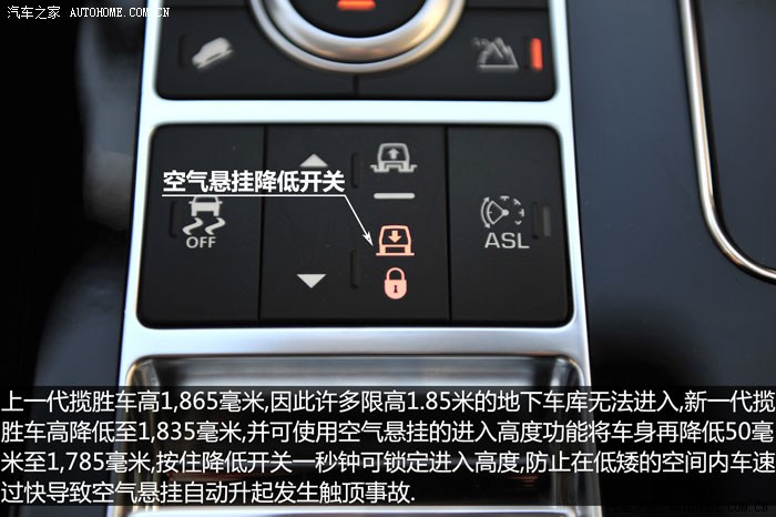 全新揽胜长*宽*高(毫米)为4,999*2,073*1,835, 相比上一代L322揽胜的4,972*2,034*1,877增加了车长和车宽,轴距则增加了42毫米达到了2,922毫米,这种设计带来了更充裕的乘坐空间,厂方宣称腿部空间相比上一代提升了118毫米,而车高降低了42毫米的设计则大幅提高了通过性,众所周知国内许多地下车库的层高非常拮据,限高1.85米的地下车库屡见不鲜,这直接导致了老款揽胜经常遇到下不去的尴尬境地,而全新揽胜1,835毫米的正常高度完全避免了进不去许多地库的担忧,拥有空气悬挂的全新揽胜还可以将车身设定为比正常高度低50毫米的进入高度,进入高度低至1,785毫米的全新揽胜甚至可以在限高1.8米的超低地库畅通无阻,为了防止在地库内因速度过高空气悬架自动升起导致发生触顶事故,还可以通过长按进入高度模式按键一秒钟来锁定进入高度。