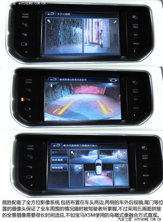 全方位车身影像系统就是大家俗称的全景摄像,这在豪华车中是个时髦的配置,对于驾驶技巧欠佳的驾驶员或者道路狭窄、弄堂巷里密集地区是非常实用的功能,揽胜的这个全方位车身影像系统启用时在8英寸触摸显示屏上会同时围绕车身显示5个小视图,分别是车头的两边的广角交叉路口视图、两侧的路缘视图和后部的拖车视图,可以选择和放大任意两个视图,但是由于各视图之间不是模拟无缝连接,看起来没有宝马X5M那种鸟瞰式像融合全景摄像视图更直观,所以需要更久时间去适应。