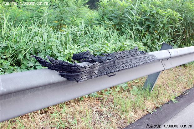 图注<往回走了好远,捡回来的轮胎胎面> 图注<胎面炸没了,但是胎肩依然起到了支撑作用,这也是没失控的关键因素> 当然了,这是一次轮胎质量和我的驾驶方式都存在问题的事故: