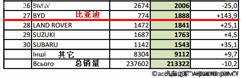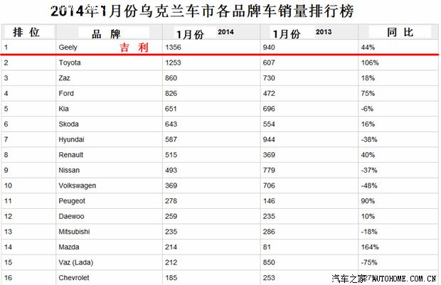 乌克兰车市有两组数据,其一是乌克兰汽车工业协会数据,二则是我下面采用的乌克兰汽车咨询机构数据。该数据显示,2014年1月份乌克兰车市销量同比下跌4%,售出10 950辆轻型车。 中国车在乌克兰