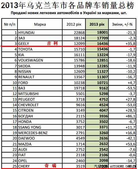 乱象丛生的乌克兰,最后埋单的一定是民众,而这一切将在乌克兰车市体现出来,政局不稳,民众购买新车必定承压,有可能出现持币观望态势,毕竟乱世中,持有现金比较稳妥。对于已经在乌克兰车市打下基石的中国自主品牌车而言,影响将在随后几个月内显现无余。 2013年乌克兰汽车工业协会数据显示,2013年12月份轻型车销量同比下跌23.6%,环比上涨10.4%,售出17047辆车。2013年乌克兰车市轻型车总销量为213 322辆车,同比销量下跌10.2%。 乌克兰车市整体销量下滑的大背景下,吉利在乌克兰车市表现则是一枝独秀,十二月份售出1927辆车,同比下跌7.4%,环比销量上涨31.1%,排在乌克兰车市销量榜首位。2013年在乌克兰车市共售出16436辆车,销量同比上涨35.8%。销量榜前三十位中奇瑞和比亚迪分列第二十五和二十七位,其余自主品牌车长城、力帆、江淮和一汽,另外合资自主MG都未上榜。