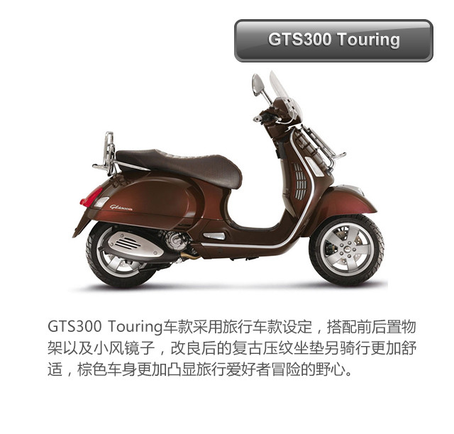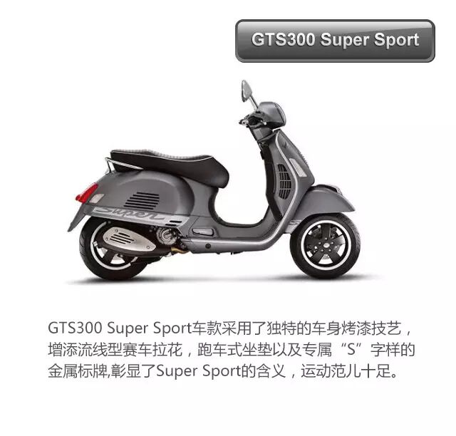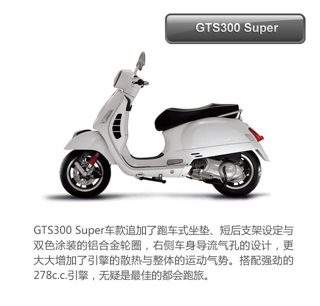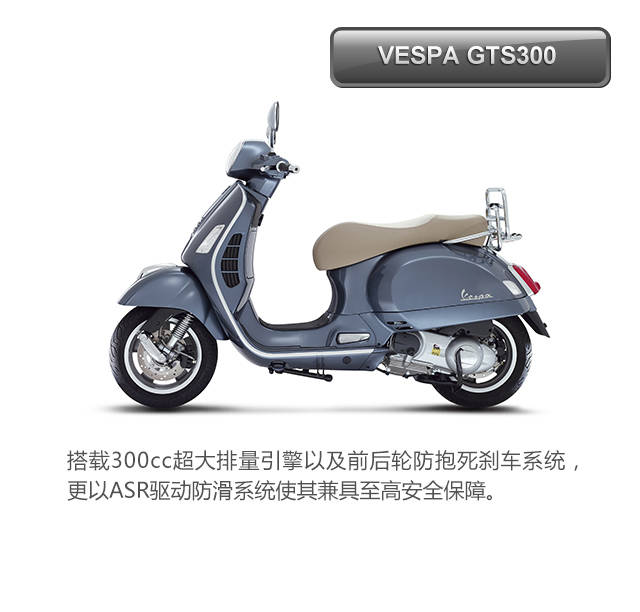 跨 上一台VESPA GTS,充沛的动力与鲜艳的色彩足够为你吸引众人关注的目光! 作为VESPA旗下主力车系,GTS兼顾经典的外形与优异的性能,是都市通行的极佳首选。GTS系列车型拥有传统的钢制车身结构,以及完美的前后车重比例 与源自飞机起落架的单摇臂避震器,全车系搭载278cc四冲程电喷引擎,最大马力为22匹,最大扭力22.3牛米,同时追加了ABS和ASR 电子辅助系统,是踏板摩托车内首见,当前后轮车速出现异常下,车身ASR电子循迹系统会适时介入帮助车身回复抓地力以及稳定性,两项电子安全防护另骑行更 加安全。