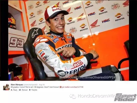 “我与HRC宣布我的更新很快乐。我一直梦想着的雷普索尔本田团队的一部分,并感谢本田的梦想实现了一年半前。一切都发生得很快,上个赛季,我从来没有想到,我能达到我们所做的。我的第一个赛季中成为世界冠军是一个梦想成为现实。这是本田的家庭的一部分一种巨大的荣誉,我很高兴留在这一特殊群体的另外两个赛季。 摩托天才马奎斯缔造68度神奇倾角天才赛手马奎斯的出现引来赛车界一片哗然,MotoGp十连冠这简直是一个让人不可思议的成绩,而且是由一名初出茅庐的小伙创造的(相对于MotoGp)。马奎斯十连冠后便出了一个问题:如果洛伦佐、佩特罗萨、罗西是外星人,那么马奎斯的绰号又是什么呢?