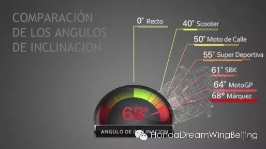 从上面这张图我们可以看出,一般速可达的极限倾角约为40度,街车50度,超级跑车55度,SBK用车61度,MotoGp赛车为64度。神奇的马奎斯居然做到了68度,让人叹为观止。我个人认为如果罗西、佩特罗萨、洛伦佐被誉为外星人,那么天才马奎斯就应该是超人-SuperMan!