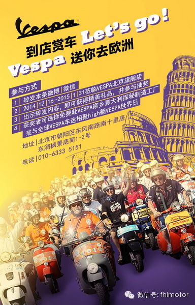 5.头奖将在2015/02/14于风火轮北京Vespa旗舰店进行抽奖,现场同时还有其他奖项!请各位参加抽奖的车友们务必亲临现场