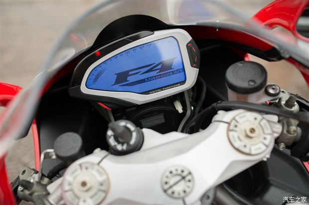 鳄鱼试驾的这辆F4RR是12年款的,只配备了8档可调牵引力控制系统和ABS防抱死系统。13款在此基础上还增加了防翘头系统和智能快速换挡,已经达到了电子系统配置的巅峰。仪表显示的职责由一块蓝色背光的液晶显示屏完成,个人认为对转速的指示不够准确易读。而且,必须吐槽一下的是,同是意大利摩托车厂商的杜卡迪已经开始用LCD全彩显示了,液晶显示是不是略微落伍了一点?