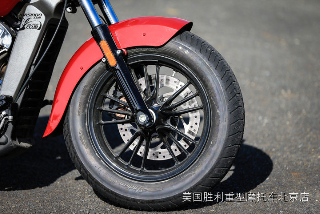 前轮造型亦与初代Scout相仿。前轮圈为五幅三肋设计,尺寸为16X3.5,原厂配胎尺寸为130/90-16