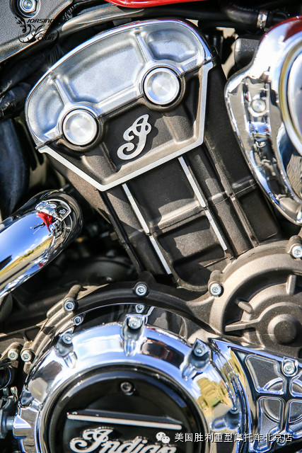 引擎是Indian Scout令人赞叹并欣赏的重要关键,采用全新设计的1130cc水冷DOHC四气门V型双缸引擎,配上口径60mm的节流阀与喷射供油系统,最大马力可达100匹,最大扭力97.7牛米。以美式摩托车而言,原厂设定的最大扭力出现转速为5900rpm,是较为特殊的现象。