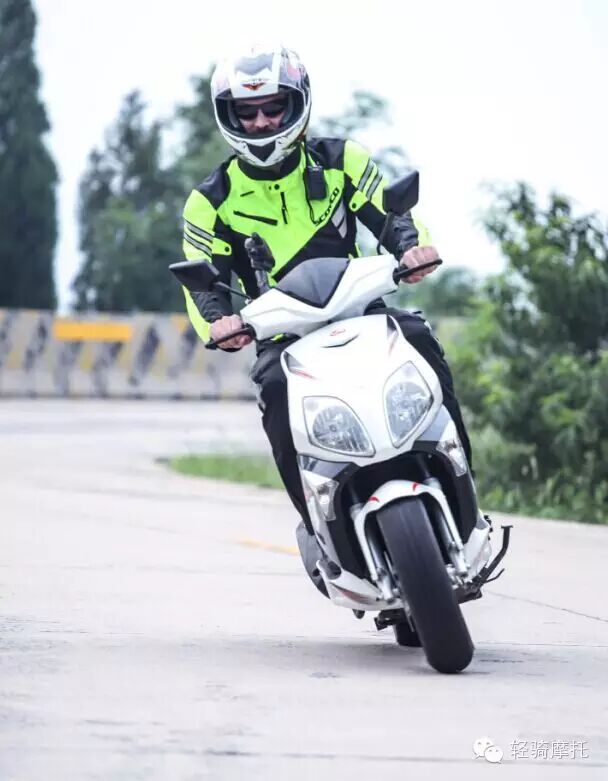 动力十足 操作轻松 QM125T-7R配置的是轻骑全新QT7高能发动机,最大功率6.9/8000 kw/rpm,进 气升程: 5.52,排气升程: 5.48,适当提高气门升程,可有效提高循环充量,降低换气损失,提高发动机动力。新型高位大腔径空滤器,进气更顺畅。该机采用了有利于形成缸内滚流的活 塞顶设计,促进油气充分混合,提高燃烧效率。发动机曲轴箱容积加大15-20%,机油量增加150ml,显著提高了机油的冷却和散热效果,使机油温度维持 在115 °C以下。该发动机整体动力、冷却性和耐久性得到进一步提升,使产品达到欧洲动力标准。同时,配备新型CVT变速箱,采用新型风扇罩及活塞背冷等先进技 术,使整车动力更强劲、高效更节油。 “天致” QM125T-7R的试骑刚 踏上城市道路不久就转至乡间小道,随后更开往多弯道、频繁上坡的山路。整个骑行过程完美表现了发动机的耐久性和可靠性。Jeremy发现该车发动机尤其在 中高速发力,转速在2000-5000rpm之间时,动力尤为突出。虽然这款小型踏板车不以速度取胜,但是每公里85千米的最高车速已完全能满足城市用车 要求。Jeremy在人车稀少的省道上曾一度试加速至95千米每小时,感觉依然动力十足,行驶平稳。 在 经过了约100公里的平坦城市公路、省道、乡道的骑行测试后,我们试车团队跟着试车手Jeremy开始了上山之行,并在近20°的上、下坡弯道路段反复测 试了该踏板的爬坡能力和制动性能。车手的评价是该车不仅在平坦大道上保留了骑行的舒适性,更具备挑战弯道、坡道的能力。大直径双泵碟刹,制动灵敏,平路、 上下坡骑行更安全。QM125T-7R配备全能防爆真空胎,大尺寸铝合金轮圈,轮胎抓地力更强,行驶更加平稳。整车使用加长加粗型后减震器,弹性系数更佳,进出弯道时的操控感更强,行驶舒适性更好。