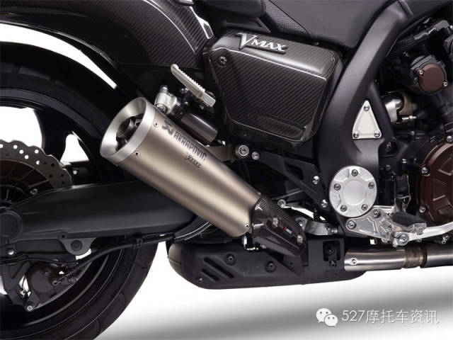 不管是油箱护罩、前后挡泥板、还是侧面的护板,VMAX Carbon全都采用碳纤维材料,排气上雅马哈也联手Akrapovic(天蝎),使得VMAX Carbon更加犀利。