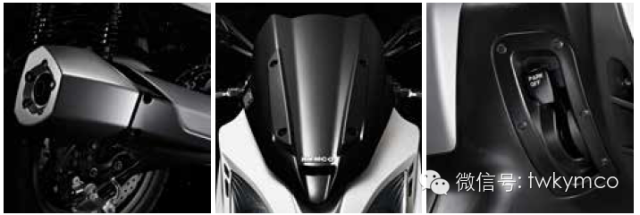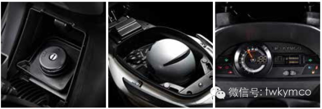 双 鹰眼大灯的下方加入LED行车灯,车尾除了使用LED之外,加入了灯条设计,是光阳近年继RacingKing 180之外另一款用上灯条式尾灯的型号。Xciting 400iABS的仪表组拥有类比式转速表,LCD显示屏则显示有车速、水箱温度、油量、与电池电量的状态等,豪华、直观、信息量大,堪称“汽车级”档次。 作为一台大绵羊,车迷们最关心的除了动力性能就是储物空间的容积了。据厂方介绍,座鞍下可以存放一顶全盔。车头前挡设有小型储物箱,内里备有12V充电插 孔。钥匙设在前挡的中央,同时也是鞍座的开关。虽然车座宽大,但仍能轻松弹起,这要归功于前端的两支油压臂支杆。右方没有杂物箱,但却加入了驻车制动。操 作方法也十分简单,向下压就锁上制动,向上抽起就解锁,实用功能和使用便捷程度令人称道。Xciting 400i ABS的外观设计偏重欧洲风格,排气管的设计融合于车身线条之中,隔热罩采用了一体化的线条设计,十分大气。