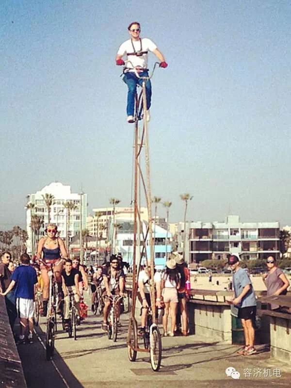 洛杉矶车友兼摄像师Richie Trimble手工打造了一辆外形怪异的自行车,看起来就像一架锥型的云梯,车座约4.42米高,而车链条的长度超过了9.75米。据悉,只花了4天时间,Richie Trimble就打造了出了这辆目前为止最高的自行车,它的重量也是相当惊人,重达275磅。值得一提的是,这辆自行车还没有刹车系统,所以危险系数极高,无论是骑起来还是看起来都是让人胆战心惊。