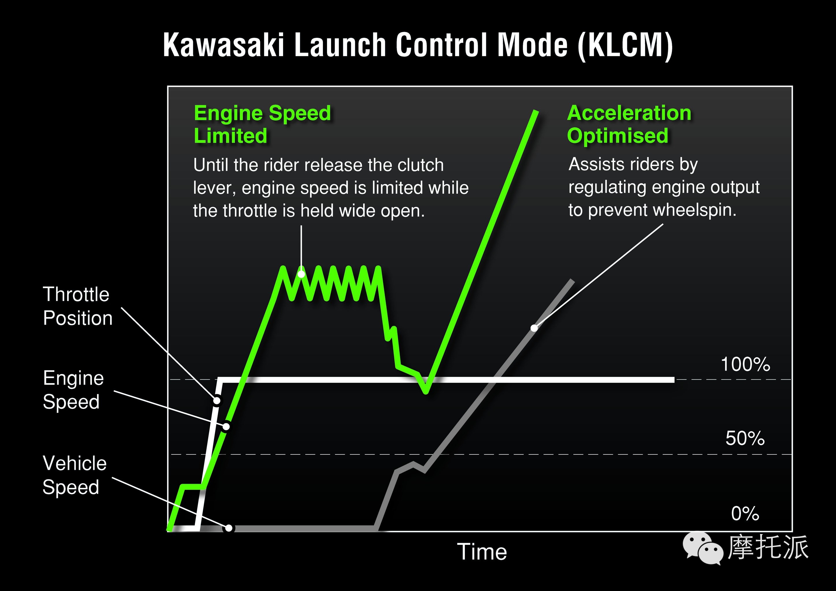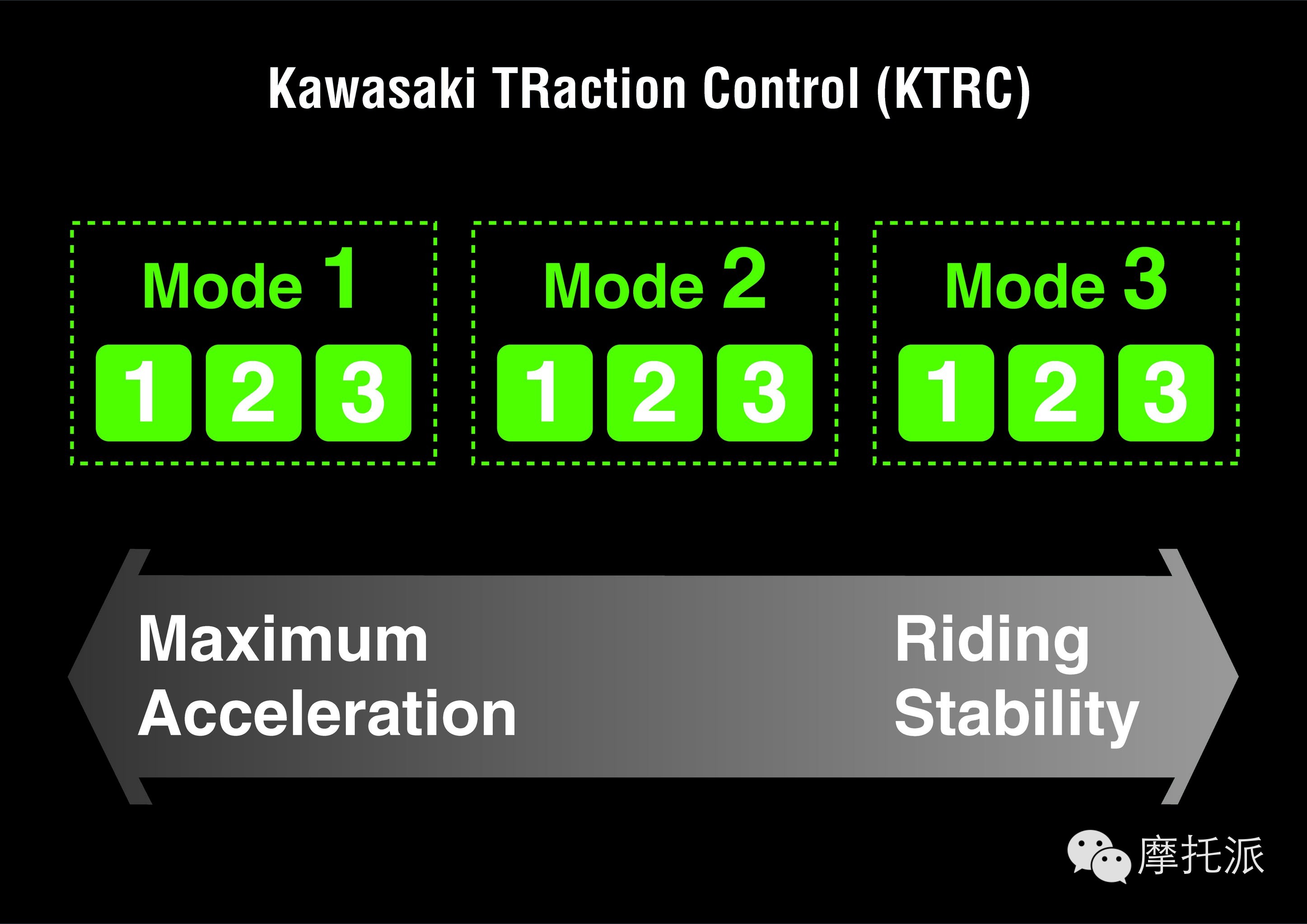 KLCM(川崎启动控制模式) KLCM 旨在通过提高刹车后加速度为车手提供便利,并从电力方面控制发动机的输出功率,防止启动时车轮滑转,最大限度地杜绝前轮离地的现象发生。车手有 3 种模式可供选择,每种模式的牵引力等级都会有所提高。