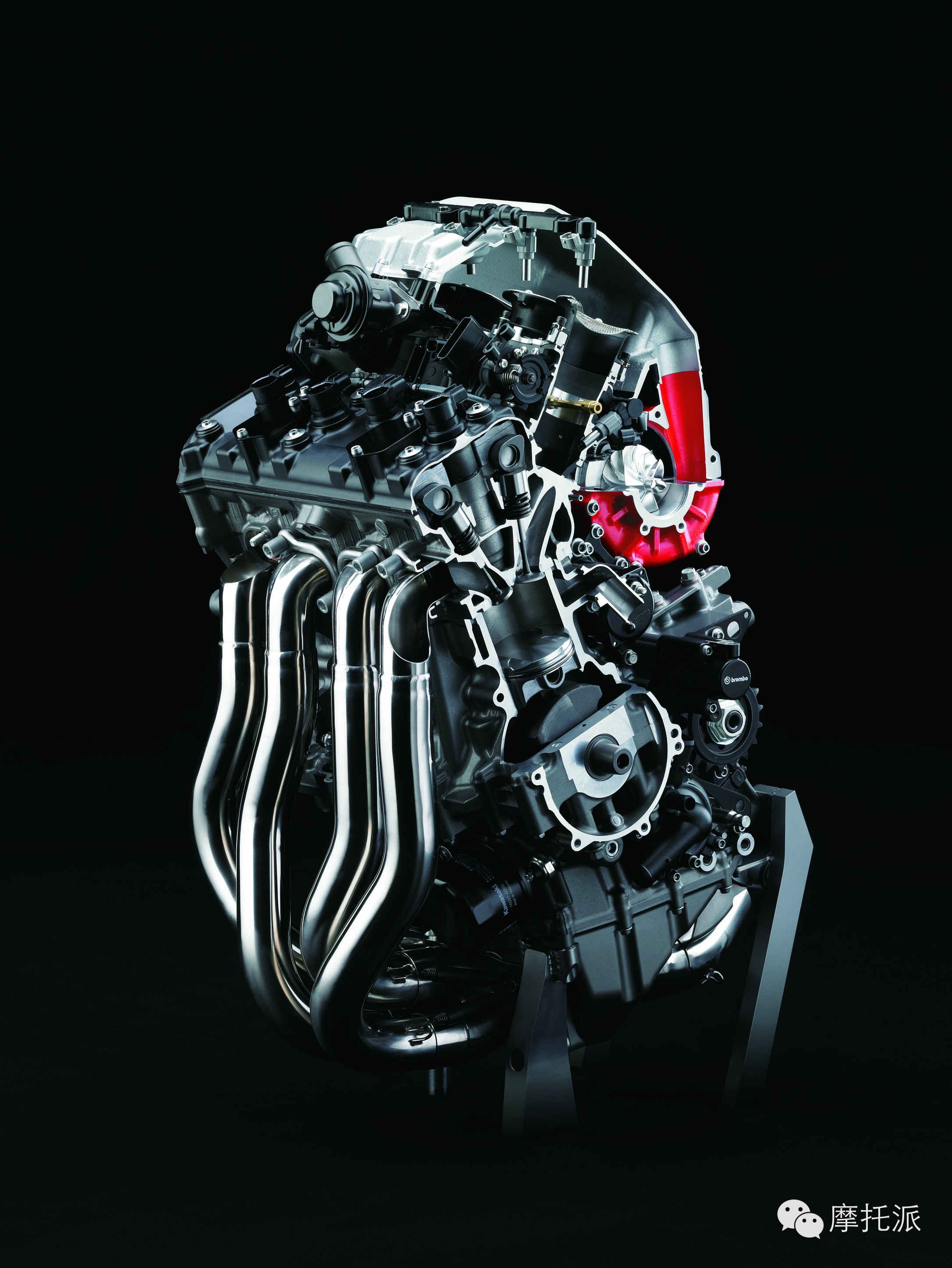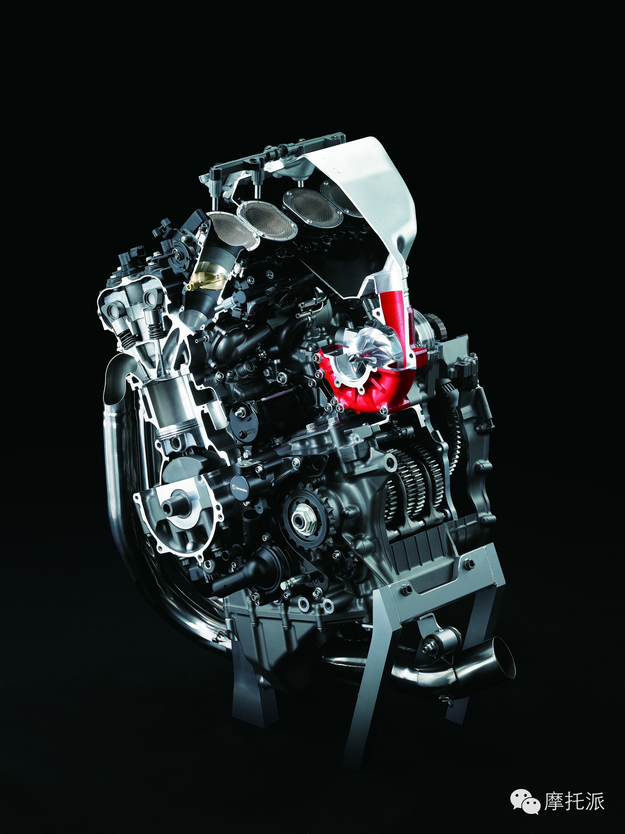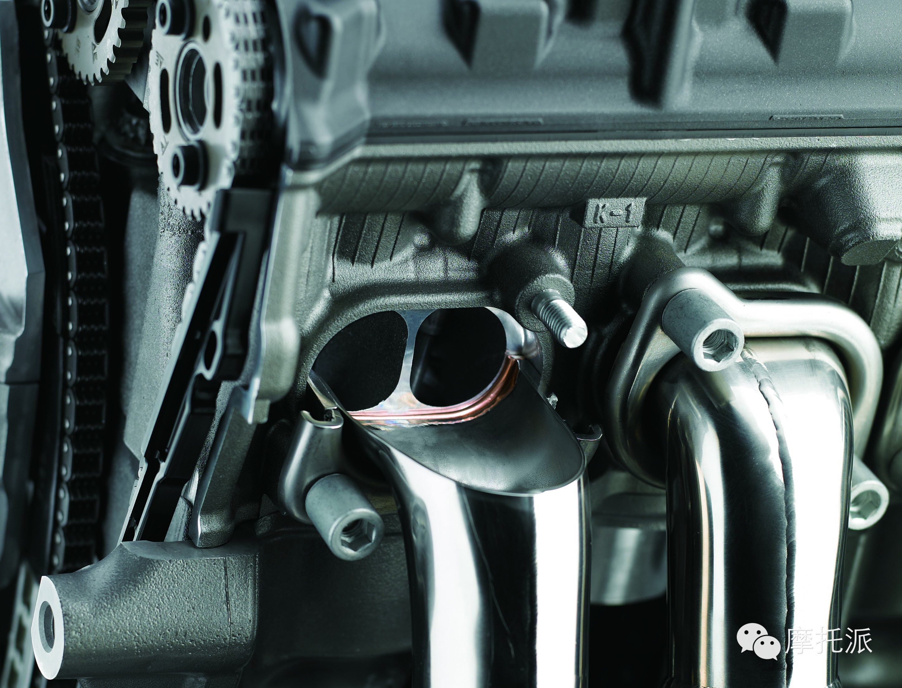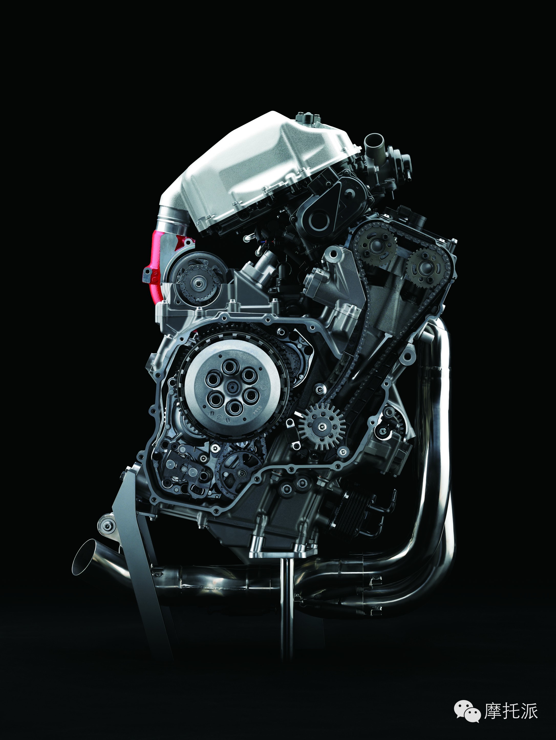 全钛排气系统设计简洁明快,其中包括排气歧管、集气管、接合管和直管扩音式消音片。每个气缸的双排气口之间均配有水套,且火花塞口周围设有大型冷却剂通道。