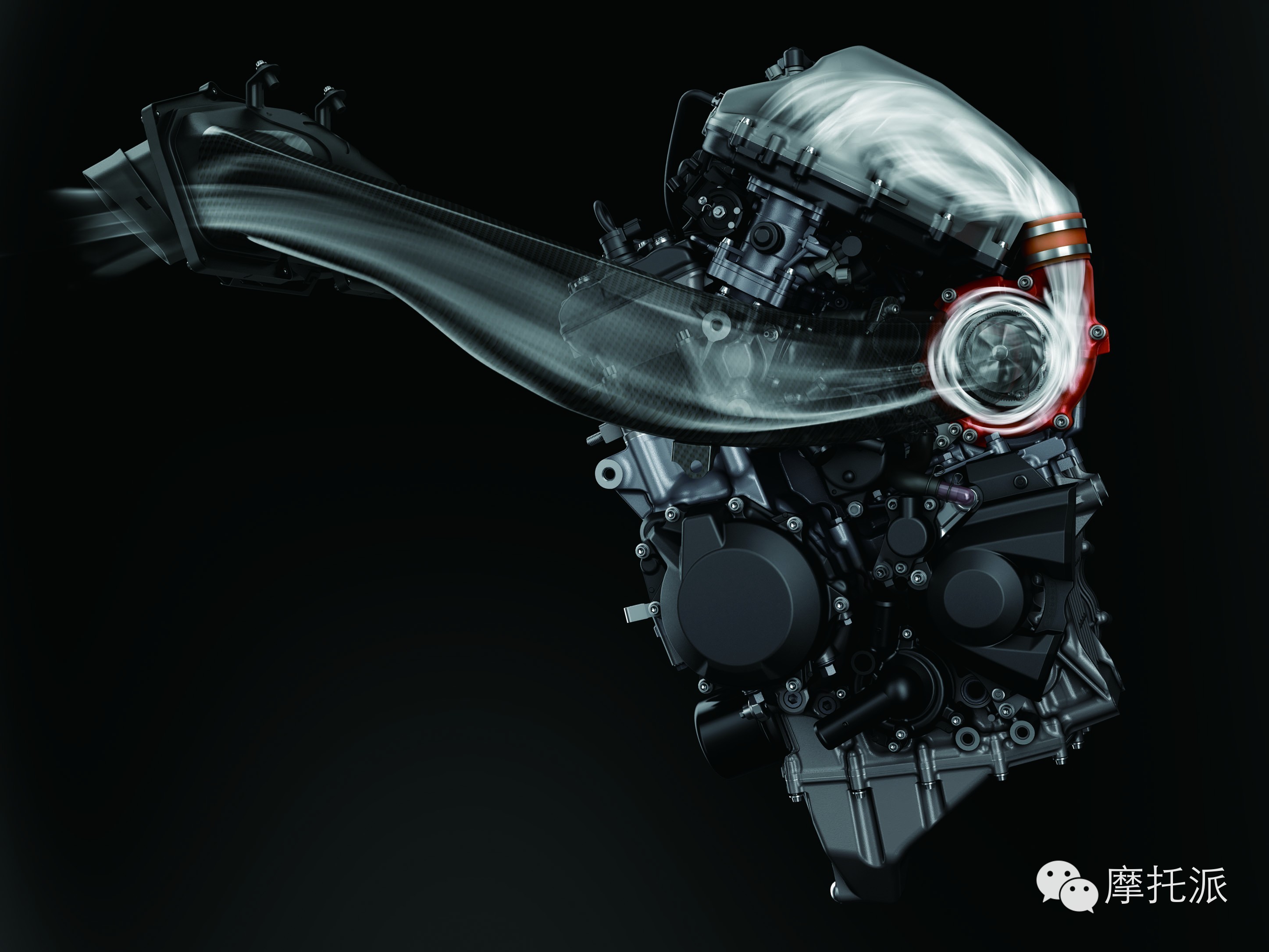 功率达到 300匹以上发动机所需的空气量远高于相同排量的标准发动机,工程师特别设计将空气通过上方整流罩上中的双重冲压进气口送至增压器。进气室容量达到6升。