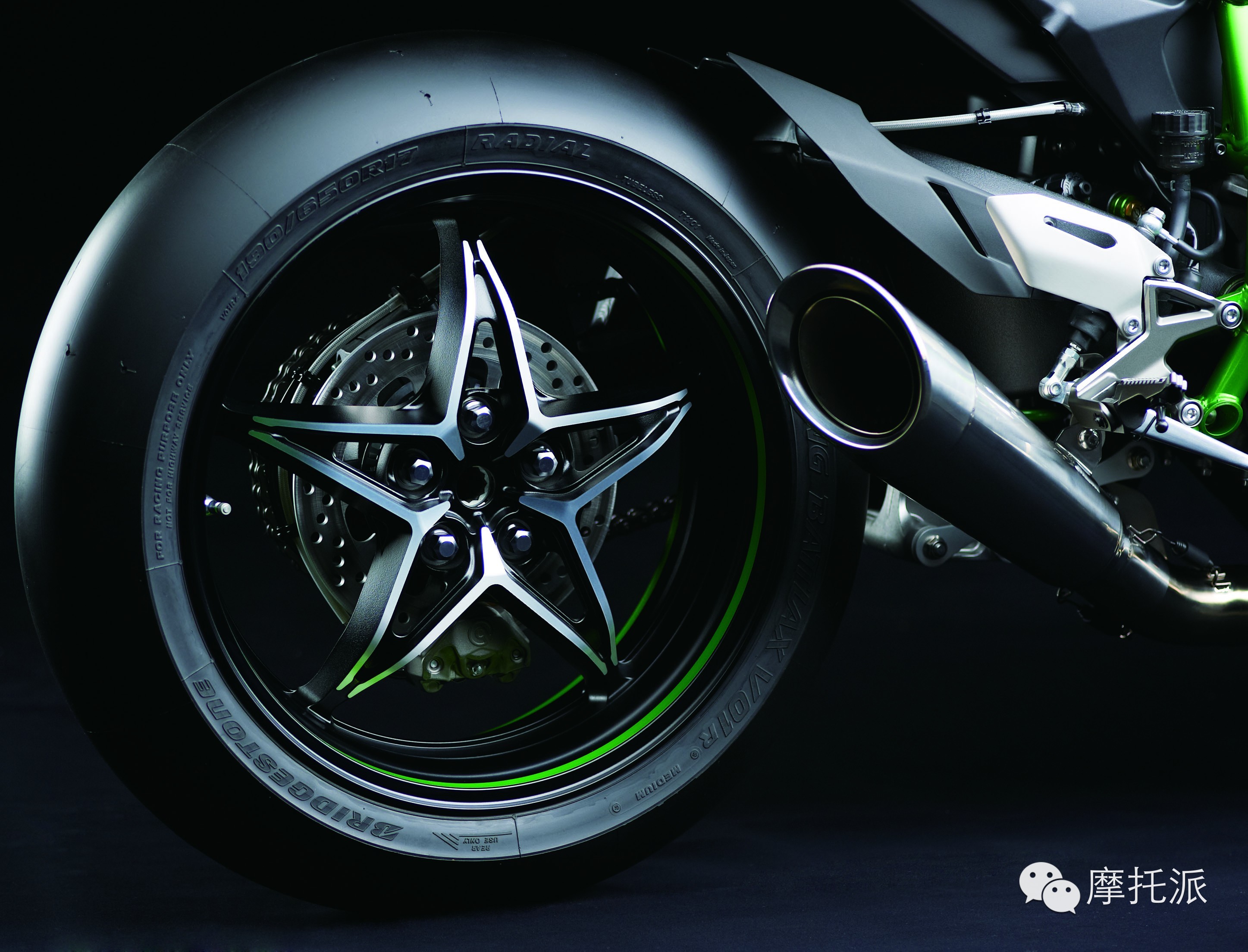 原创设计的铸铝车轮是专为 Ninja H2R 设计的。后轮钢圈内侧上的滚花能够防止车轮因发动机产生的强大扭矩打滑。星形图案的五幅车轮设计适合超高速行驶的高强度要求,为保证Ninja H2在其超高速行驶时具有足够的耐久性,川崎通过评定最终选择了普利司通的超级摩托车比赛用轮胎(RACING BATTLAX V01),这款光头胎完全能够满足设计要求。