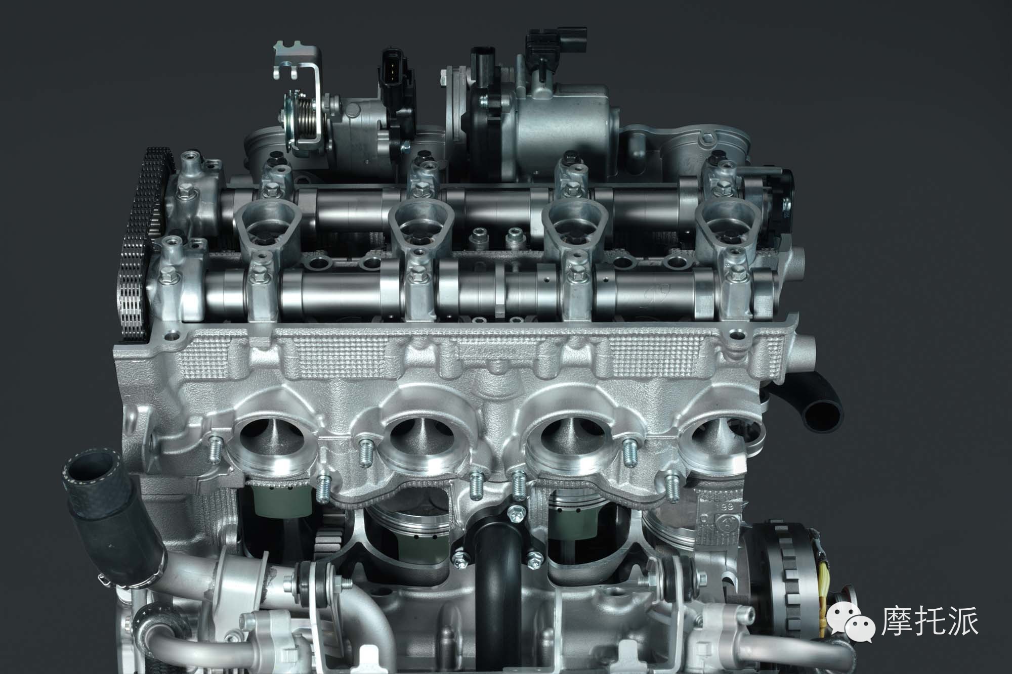 新款YZF-R1的引擎来自YZR-M1的技术“下放”,虽说采用了排量同为 998cc直列 四缸的发动机,但新引擎在缸径、行程、压缩比方面都做出调整,同时在轻量化方面也向前迈进一大步。 YAMAHA独有的十字曲轴技术与上一代相比更先进,曲轴惯性设定比前一代降低20%,通过靠近外侧汽缸的轻量化平衡轴与交错点火时间的配合,达到引擎反应更为灵敏同时还可保证线性扭力输出的目的。