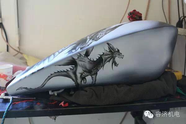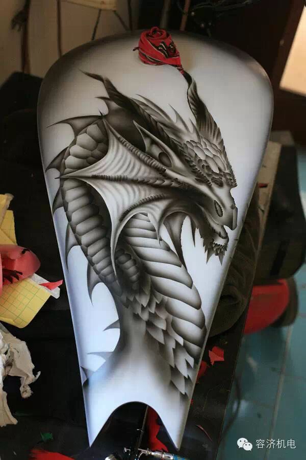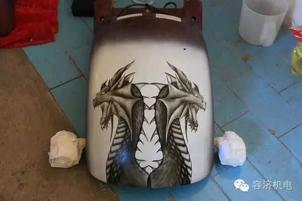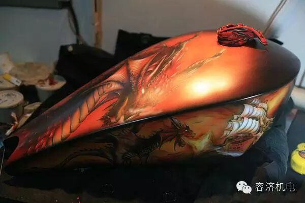 一个小小的油箱上,龙是活着的,并且如此淋漓尽致,当龙跟摩托车结合在一起的时候,就是一件活着的艺术品。彩绘的过程是痛苦的,新入手的爱车为了披上美丽的外衣,被拆的七零八落。油箱上面的彩绘,打掉原漆的时候,手颤抖了。。。。。。