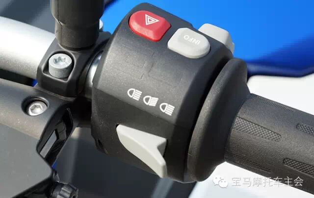 左把手前端及上端,则有红色的警示灯开关、INFO 仪表板资讯切换功能键,下方是标准的扳机式超车灯,但将扳机向前推,则是远灯切换开关,把灯具相关功能集中在同一开关上,还蛮直觉化的设计。