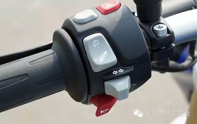左把手的开关部份,BMW 的重型机车把手通常功能都很多,在 F800R 上也不例外,在大多数车种作为远近灯切换的开关,F800R 则是 ASC 自动稳定控制系统开关及 ESA 电子悬吊可调的按钮,下方则是方向灯与喇叭按钮。