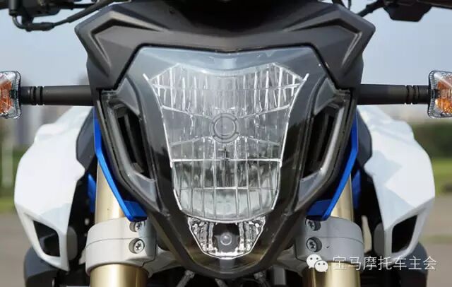 2015 F800R 采用全新的车头设计,取消原有的不对称双大灯,改以单一灯具设计,下方则有一颗小灯灯泡,两旁则是造型进气坝,灯具给人的第一眼印象还蛮像外星人脸,非常前卫的设计。