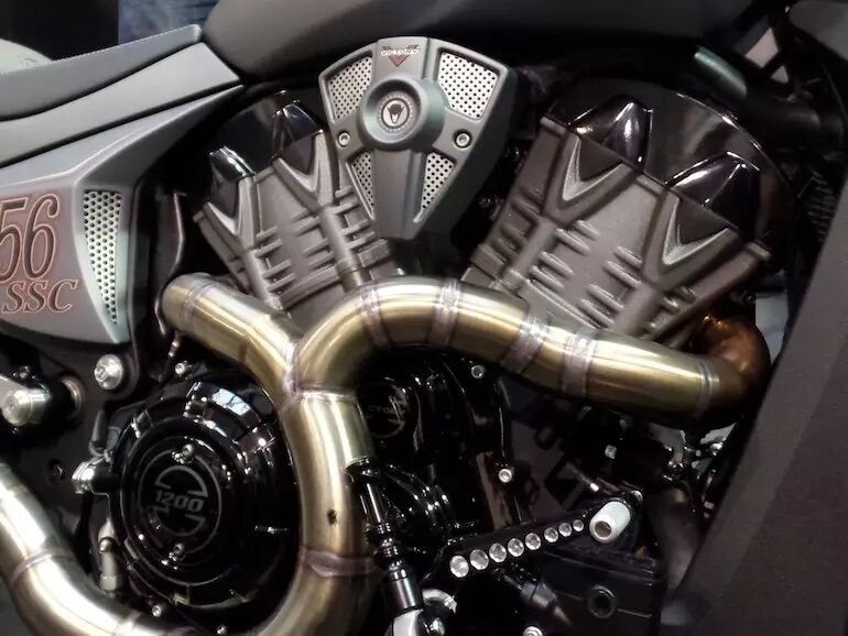 “点火”所搭载的60度夹角V型双缸发动机,没有采用美式巡航惯用的OHV气门机构,而是胜任高转速的DOHC,并配上了液冷散热系统,确保持续高动力输出;排气量高达1200cc,胜利声称这台动力装置“在同级别中爆发最强动力”。