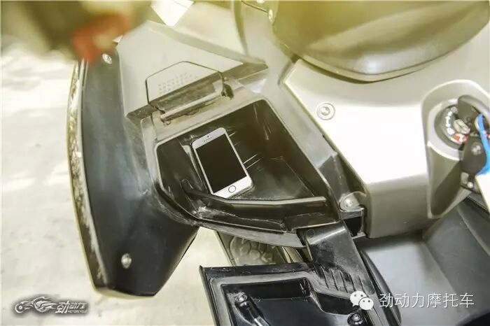 作为一辆大踏板,储物空间必不可少。放个零钱、高速通行票、钱包、手机都显得尤为重要。宝马C650GT在车把左右侧有各有一个储物盒,空间表现还是非常不错的。特别需要说明的是,左侧储物盒内部有一个隐蔽的12伏电源,可以为手机进行充电。