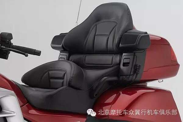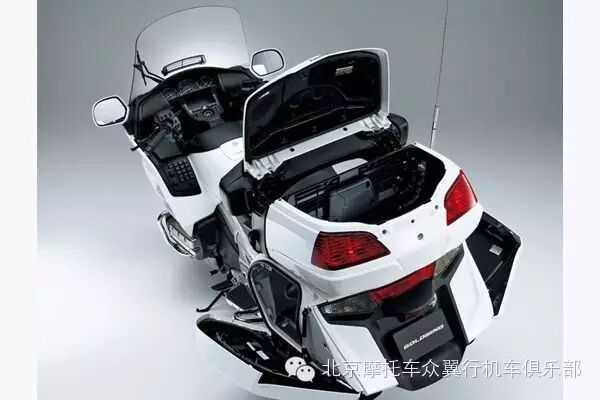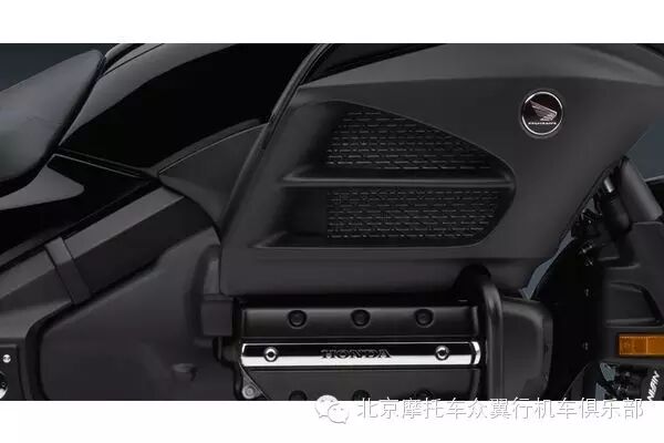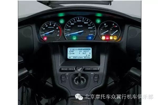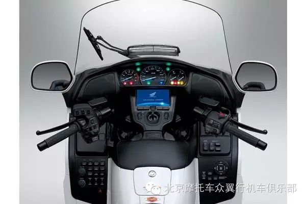 科技感十足 Honda GoldWing一向都以科技感十足的骑乘座位驰名,GoldWing GL1800那看似繁复的仪表与控制钮,意味着此车的配备齐全至极;散热水箱位于左右两侧,当车速低于25km/h时,里面的散热风扇就会作动将热气抽走,以确保热气不会直扑车手;旅程计算机与音响系统的液晶显示荧幕分辨率为110×254dpi,当钥匙一开启,电门荧幕便会慢慢浮现一对金翼与GoldWing图案,当后座行李箱没关好时,液晶银幕也会出现警告提示;而自动巡航供油系统采用16bit CPU,在处理速度上比旧款快上40%。GoldWing GL1800的车尾造形融入了一个大型的行李箱与侧边两个大容量的置物箱,上方大型行李箱的容量为62公升附加前方开口5公升的置物空间,侧边两个大型置物箱每个容量为40公升,总共提供了147公升的置物空间;如此「巨大」的车尾置物空间在造型上并不会感到突兀,且与车头造型相呼应,让整辆GoldWing GL1800看起来科技感十足。