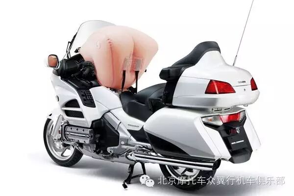 安全气囊 本田金翼在摩托车业界率先为量产车型配置了安全气囊系统,气囊位于油箱与仪表台之间,摩托在发生前部碰撞时气囊弹出并形成气帘,给予驾驶员正面保护,有效地降低了伤害的风险。