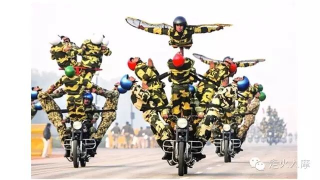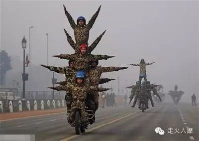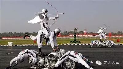 秉承着不想当钻火圈冠军的手艺人不是好士兵的信条,这支印军摩托车表演队曾以各种高难度骑行姿势打破多项吉尼斯纪录,包括11辆摩托车载着151名士兵行驶215米。