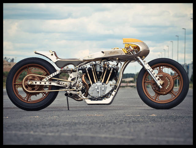 看一眼Kestrel,经Ian Barry由一台1970年Triumph Bonneville改装而成,并且仅从外观便能参透它名字的意义:它看起来简直能刺穿空气。对其进行的添加如铝、黄铜、青铜、铜、金叶子,铁和皮革,加上其内核的全部裸露,使得它极具“吸睛”效果。