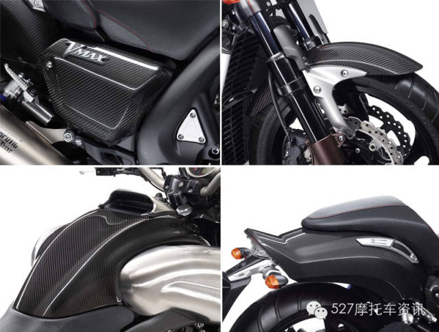 不管是油箱护罩、前后挡泥板、还是侧面的护板,VMAX Carbon全都采用碳纤维材料,排气上雅马哈也联手Akrapovic(天蝎),使得VMAX Carbon更加犀利。
