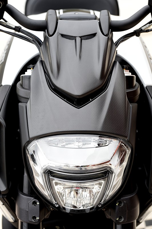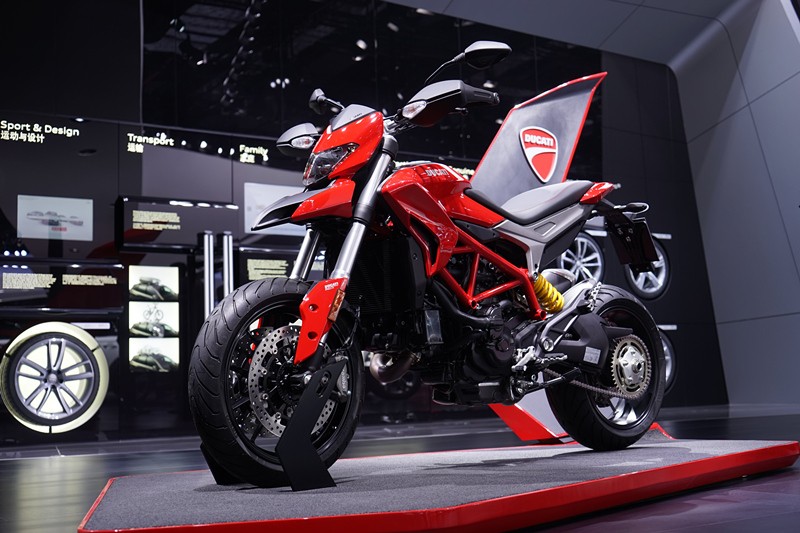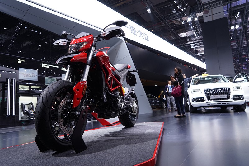 杜卡迪在本次上海车展媒体日首日展示的是 Hypermotard 骇客车型,此车型自从 2014年获得国家 CCC 认证并重新调整了价格以来,销量一路攀升,该车型以优秀的通过能力、利落的外形设计、卓越的整车性能、超高性价比优势、灵活的操控性和极高的驾驶乐趣抓住了众多车迷的心,目前官方指导价为 13.3 万元人民币。在观众日,杜卡迪展区将再次为现场的观众带来惊喜:2015款 Diavel Carbon 魔鬼碳纤版。