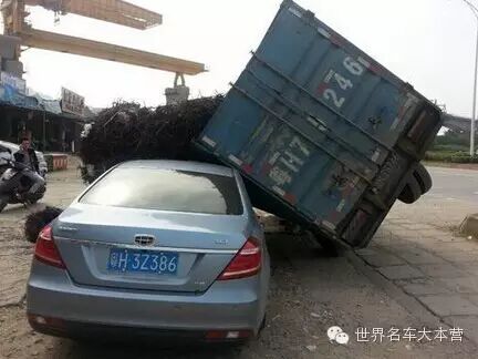 一车的钢筋就这样倒在了吉利帝豪上,还好只是微微变形,整体架构完好。车内人安全无恙,人们很难想象会有这样的奇迹发生,尤其是发生在自主品牌的车型上。