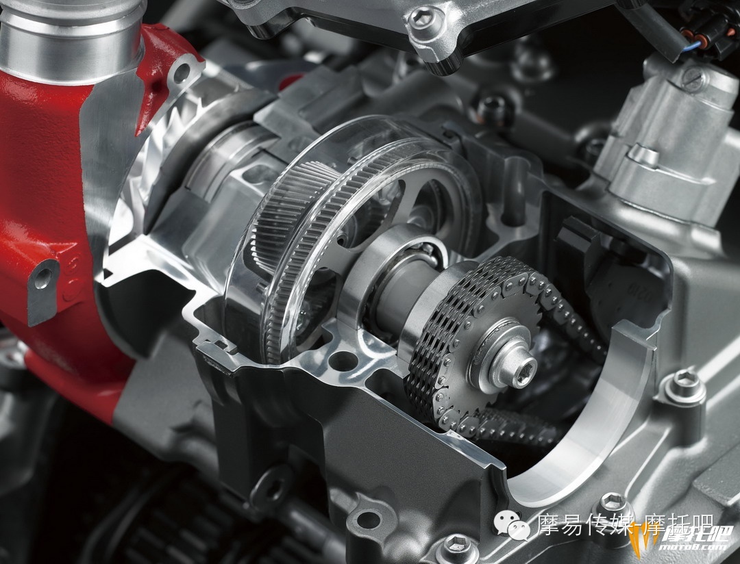 机械增压器的行星齿轮传动机构,结构非常紧凑精巧。图片右上方可以看到增压器链条的涨紧器。装有两个涨紧器的摩托车引擎是很少见的,宝贝虎此前只见过VFR800有两个涨紧器。