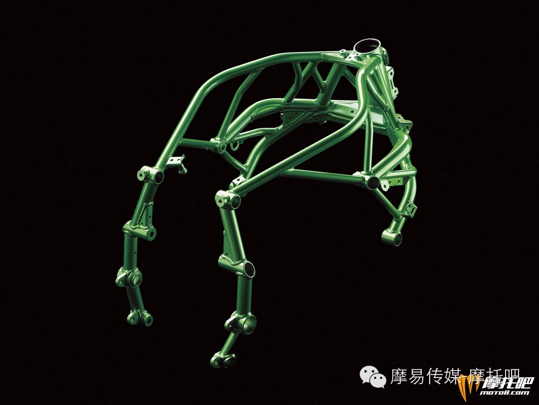 “H2的马力超过300p,这意味着车体要承受来自后轮的强大的推动力。传统的铝合金车架强度较高,而韧性较差,如果采用铝合金车架,那么为了承受后轮的推力,车架的强度必须很高才行,这会使车架的韧性变差,不利于操控。所以我们换了一种思路,将后摇臂链接在发动机上,由发动机承受后轮的推动力。由此车架可以不必直接承受推力,因此采用了高强度钢管Trellis车架,通过计算机辅助设计得到了良好的刚性和韧性,使H2拥有良好的操控。单边摇臂的应用主要是为了减少排气管外探的尺寸,使H2有更低的过弯倾角。”